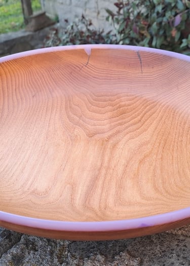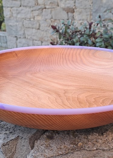 Široka skleda iz hrastovega lesa. Rob je narejen iz pigmentirane epoksi smole. Zaključeno z oljem in voskom.