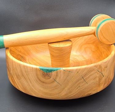 Terilnik za oreščke iz lesa češnje, polnjen z zelenim epoxy pigmentom. Zaključeno z oljem in voskom.