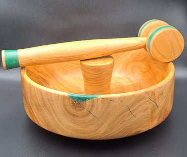 Nutcracker from a cherry wood. Cracks filled with green pigmented resin. Oil and wax finished.