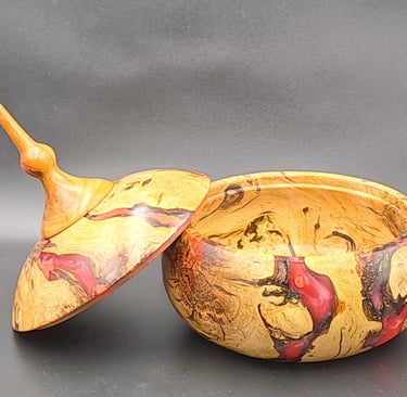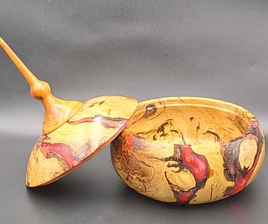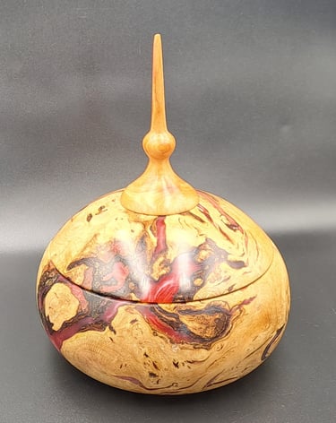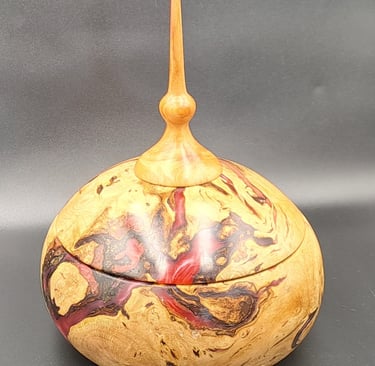 Beautiful box from a rose wood. Voids and cracks filled with pigmented resin. Finial made of Smoke tree wood. Oil and wax finished.