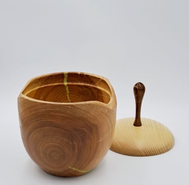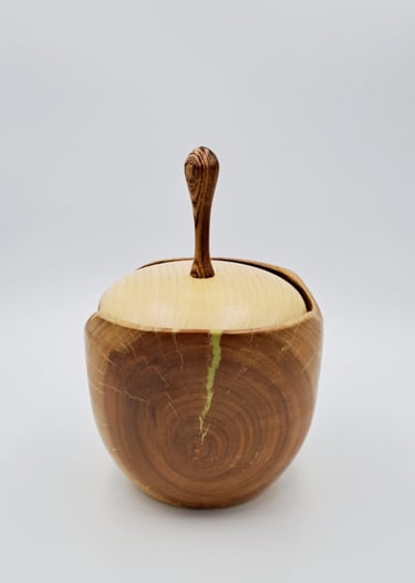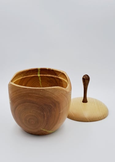 Posodica s pokrovom je iz vrst lesa. Dno je iz lesa češnje, razpoke so polnjene z zeleno epoksi smolo. Pokrov je iz lesa javorja. Špica je iz lesa starega hrastovega vinskega soda. Zaključeno z oljem in voskom.