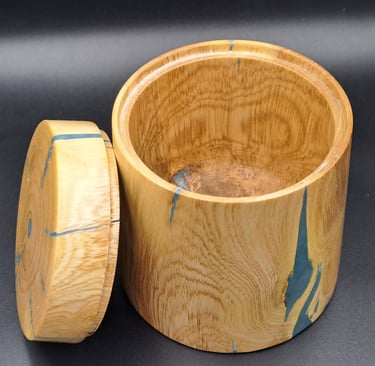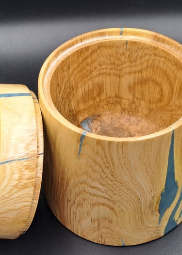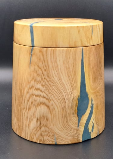 Posodica s pokrovom je iz lesa lipe. Razpoke so ponjene s pigmentirano epoksi smolo. Zaključeno z oljem in voskom.