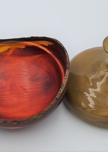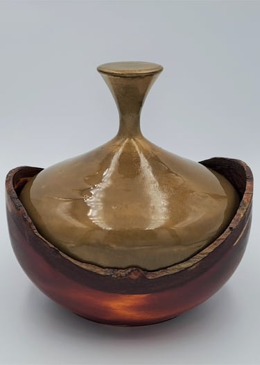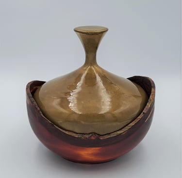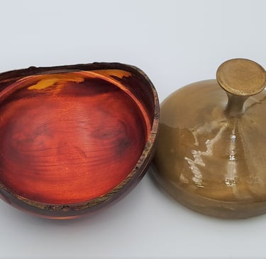Posodica s pokrovom z živim robom. Dno posode je iz barvanega jesena, pokrov je barvana lipa. Zaključeno z oljem in voskom, pokrov je lakiran.