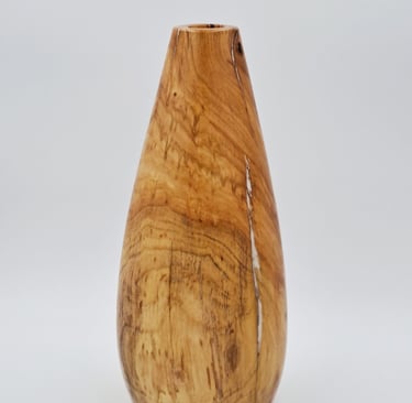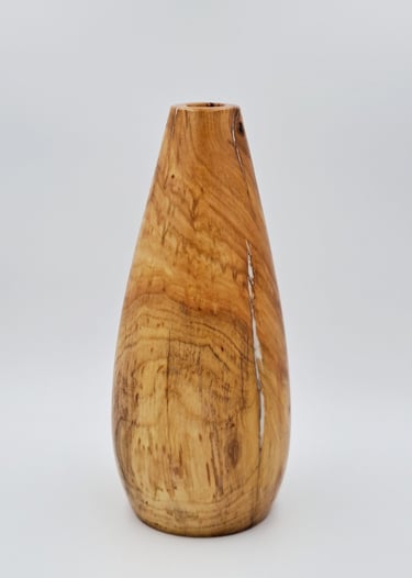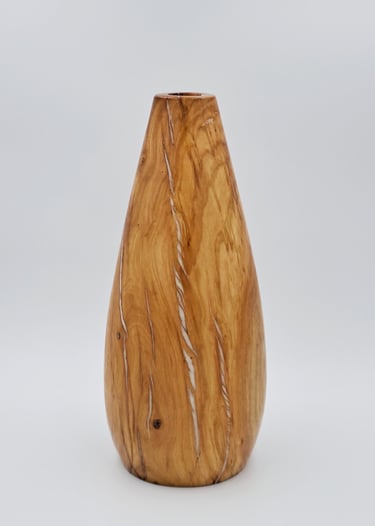 Vaza iz lesa požganega ruja. Razpoke polnjene z biserno epoksi smolo. Zaključeno z oljem in voskom.